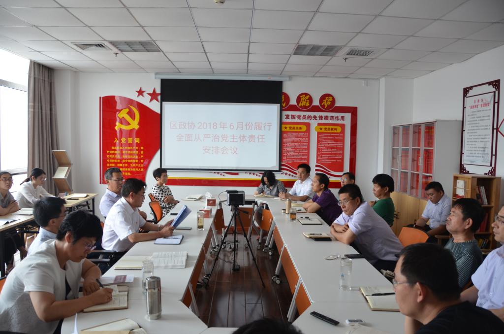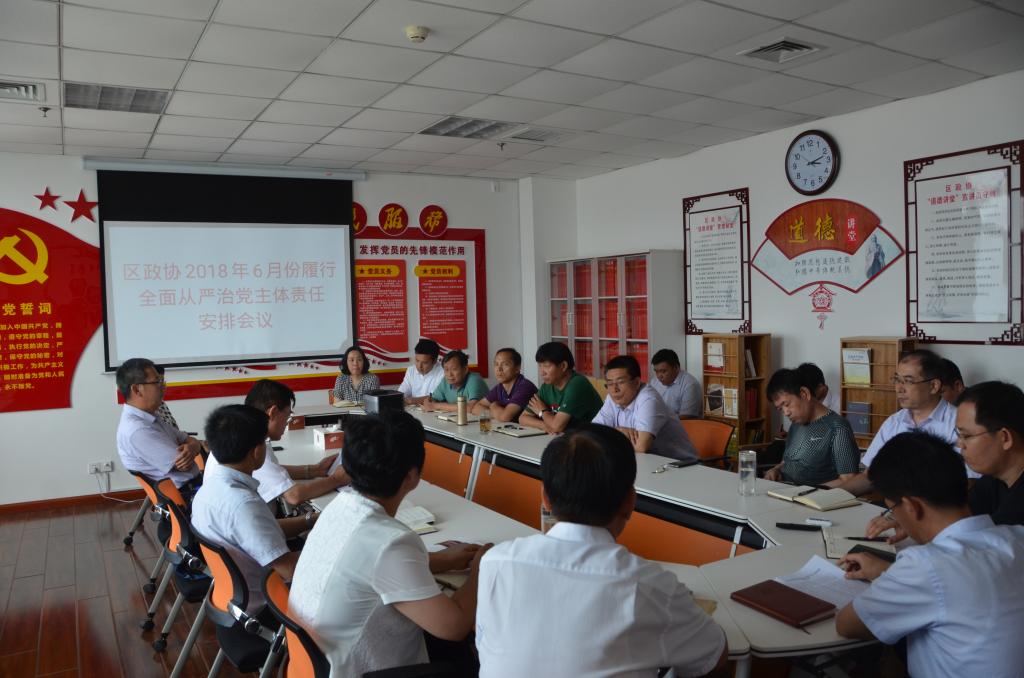 6月27日,区政协在党建活动室组织召开区纪委推送的6月份履行全面从严治党主体责任任务安排会议,机关全体干部职工参加,主席张葆春主持会议。会议传达学习了区委《关于认真落实<关于在全市开展落实中央八项规定精神自查自纠工作的通知>》(垦办发电〔2018〕28号),以及5月11日中共山东省纪委《关于4起违反中央八项规定精神问题的通报》和6月4日中共山东省纪委《关于5起不担当不作为典型问题的通报》。