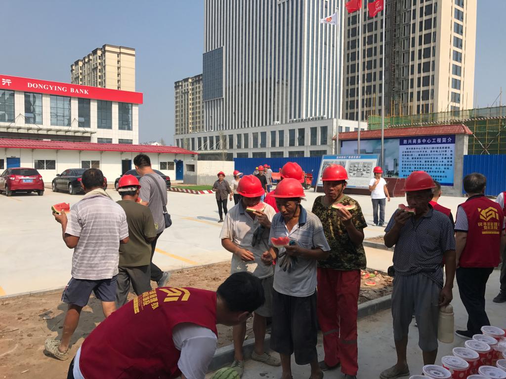 在建设工地上,志愿者们将绿豆汤、西瓜等慰问品送到一线建筑工人手中。据了解,该项目是垦利区在建重大项目之一,工期紧,任务重,建筑工人们无论酷署还是严寒,都坚持不懈,他们为垦利建设做出的贡献。志愿者们叮嘱建筑工人要做好防暑措施,注意安全施工。