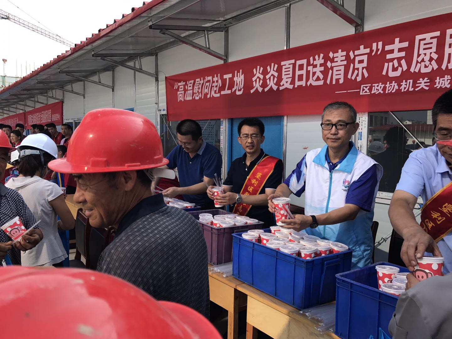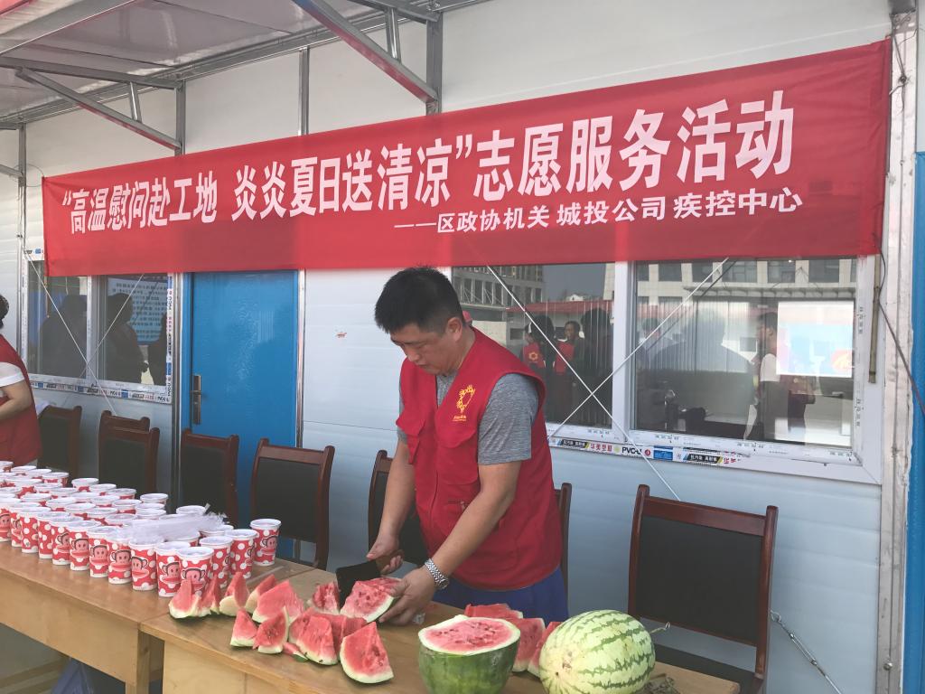 为关爱建筑工人的身体健康,预防高温中暑,7月21日上午,区政协机关志愿服务队联合城投公司志愿服务队、疾控中心志愿服务队到胜兴商务中心在建工地开展“高温慰问赴工地,炎炎夏日送清凉”活动,走访慰问冒着高温仍坚守岗位的一线工人,为他们送去绿豆汤、西瓜、防暑降温用品及政协关爱。